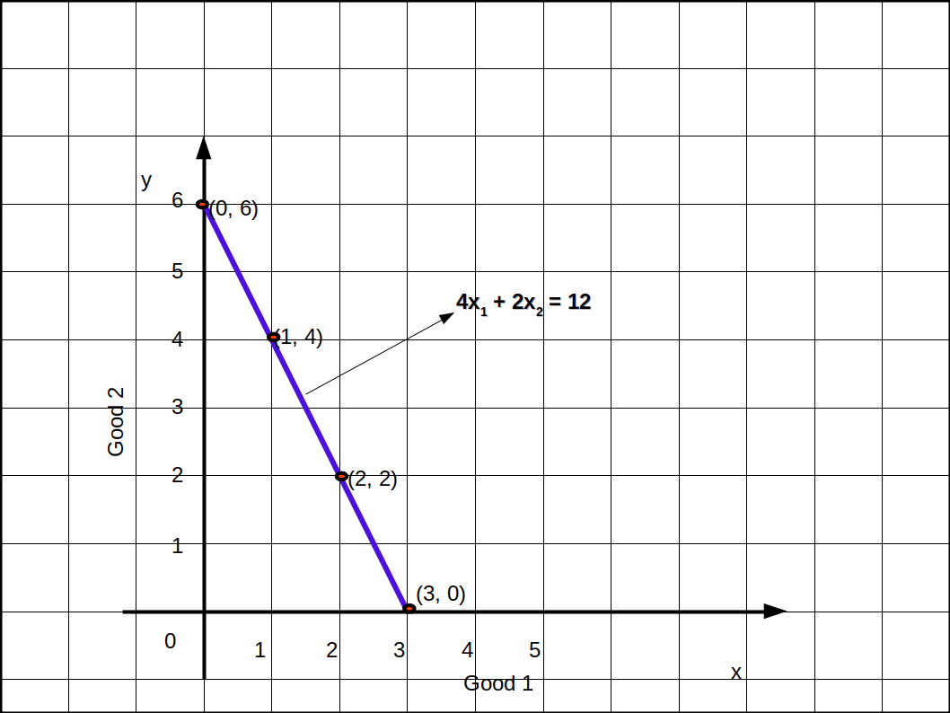 M = 12 , P1 = 4, P2, = 2 ആയാല് അവിടെ ബജറ്റ് പരിധി എന്നത് 4x1 + 2x2 ≤ 12 ആണ്.